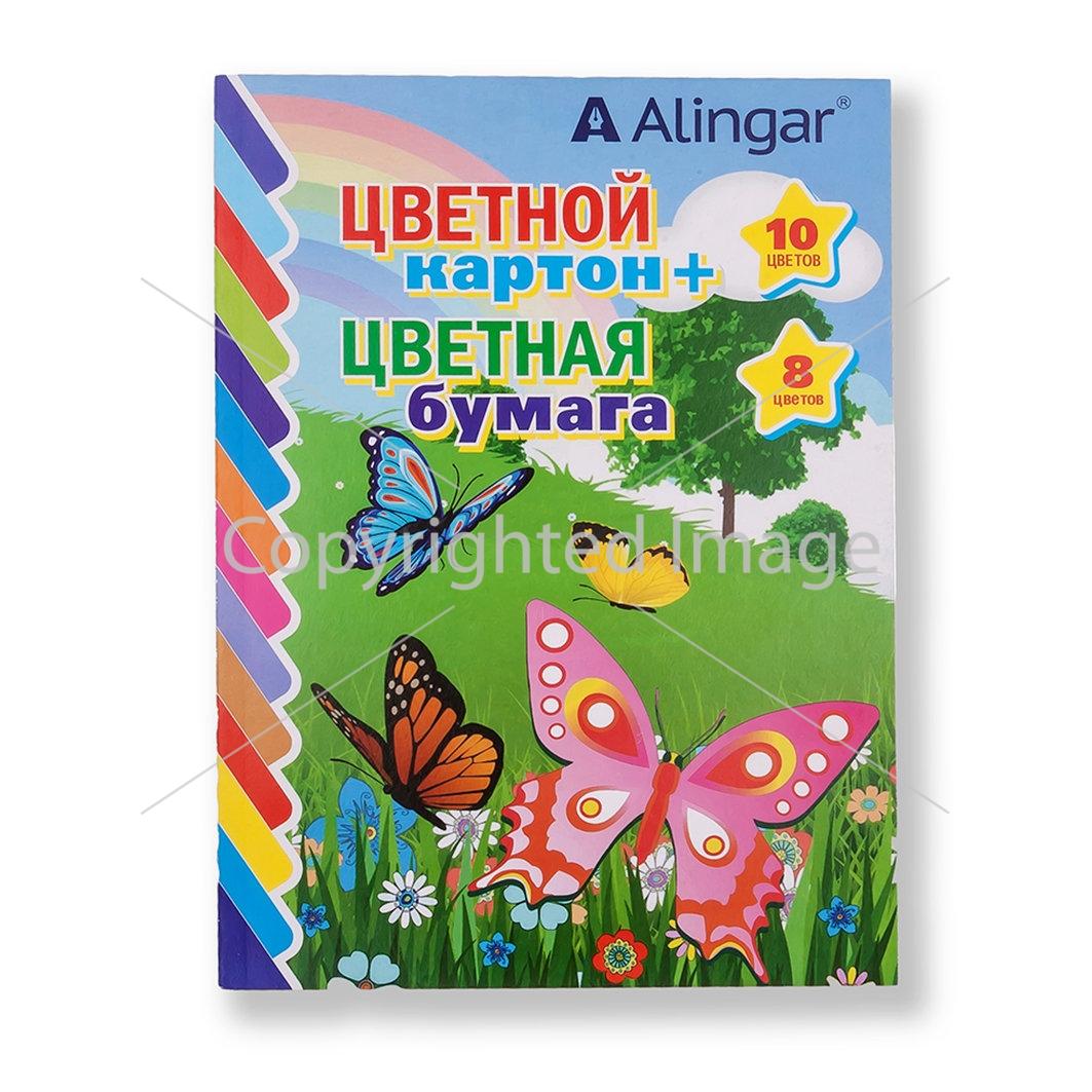 Набор цветного картона Alingar А4 (10л + золото и серебро) и цветной 2-х сторон. бумаги (16л/8цв), на скрепке