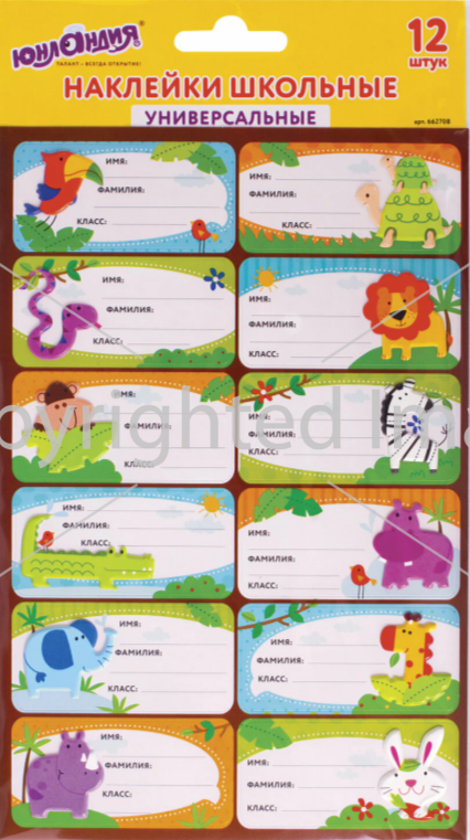 Наклейки для маркировки школьных принадл. ЮНЛАНДИЯ (14х21см), 12шт., в ассортименте